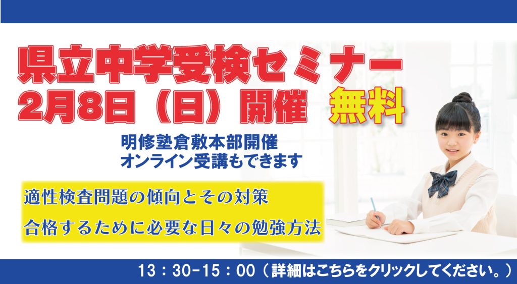 明修塾では、毎年『県立中学受検セミナー』を開催しております。倉敷本部教室での実施と同時間帯、オンライン(Zoom)でも配信いたします。こちらは県立中学適性検査対策コース責任者による進学セミナーで、今春の適性検査問題の傾向とその対策、合格するために必要な日々の勉強方法等をお話しします。勉強に関しての疑問や、家でのお子様の学習方法などの不安をこのセミナーで解消してください。是非、この『県立中学受検セミナー』にご参加いただき、今後の学習に役立てていただければと思います。