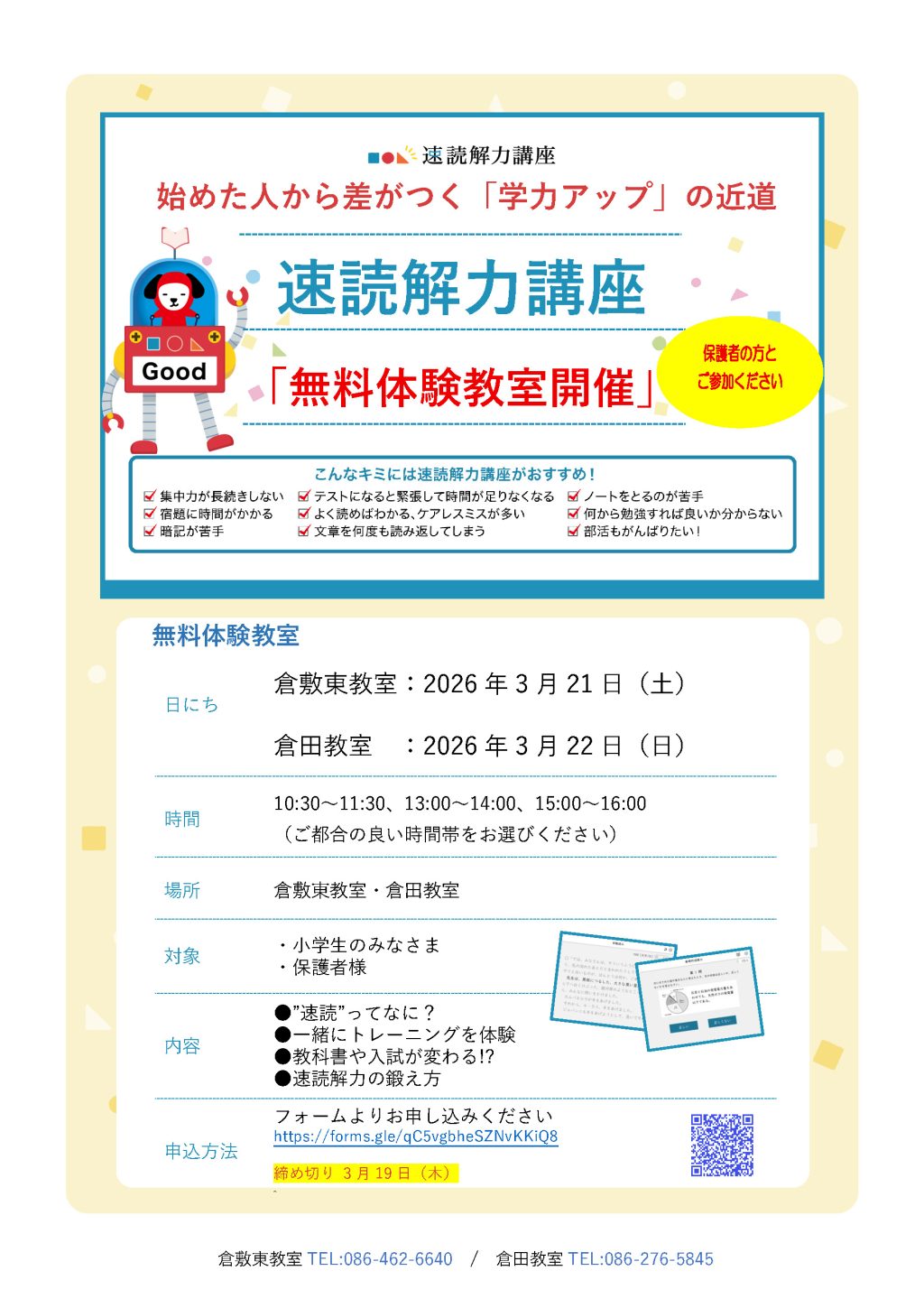倉敷東教室・倉田教室にて無料体験会を開催いたします。申し込みはこちらをクリックしてください。