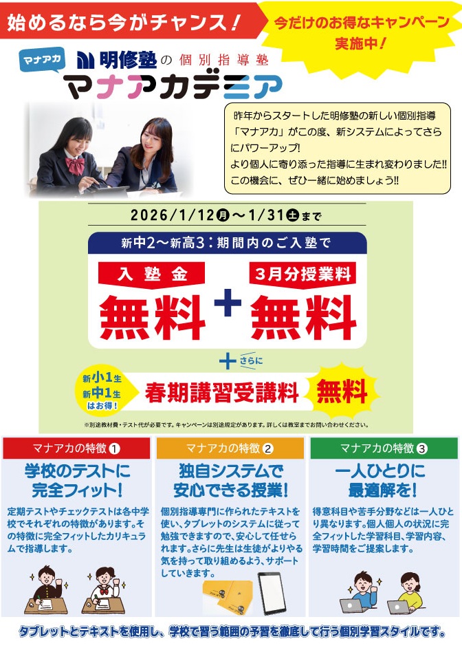 「明修塾の個別指導:マナアカデミア〈マナアカ〉」にお任せ!